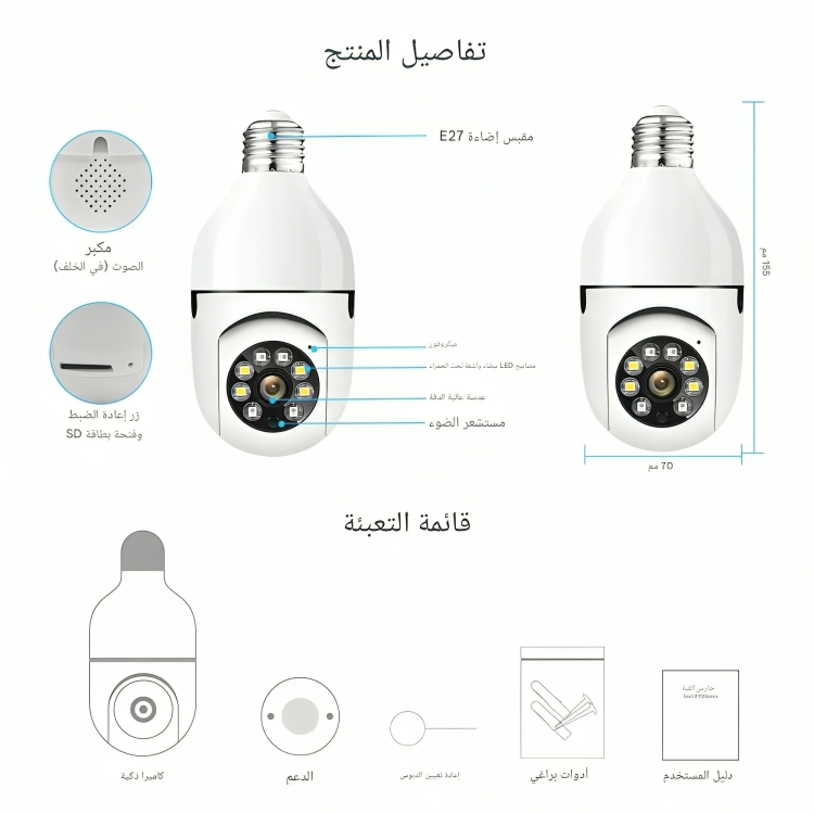 احصل على راحة البال مع كاميرا IP الذكية بدقة 2K (3MP) التي توفر لك حماية أمنية متطورة ومراقبة ذكية لكل زاوية في منزلك. تأتي هذه الكاميرا بتصميم لمبة E27 لسهولة التركيب، وتدعم شبكة Wi-Fi 5G لضمان اتصال سريع ومستقر.